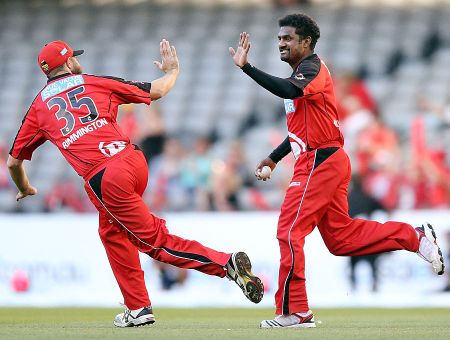 MELBOURNE, AUSTRALIA – DECEMBER 22: Muthiah Muralidaran (R) of the Melbourne Renegades celebrates his catch with Nathan Rimmington during the Big Bash League match between the Melbourne Renegades and the Brisbane Heat at Etihad Stadium on December 22, 2012 in Melbourne, Australia. (Photo by Michael Dodge/Getty Images)